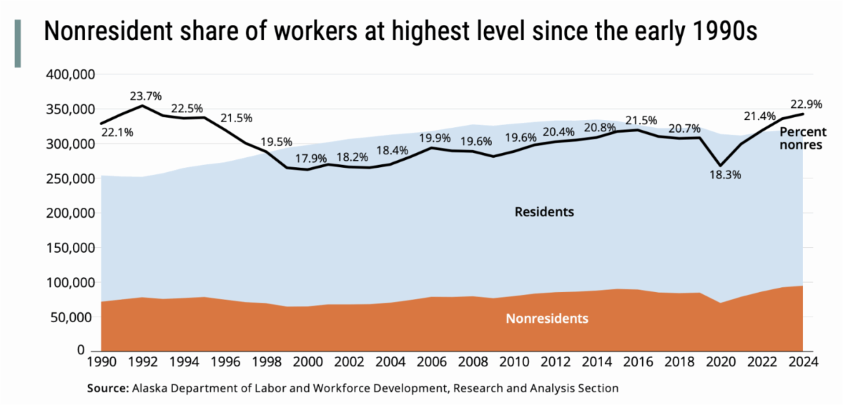 Alaska Department of Labor (DOL) revealed a growing, troubling trend this month. Nonresidents now hold 23% of all non-federal jobs in Alaska, approaching a record high. This indicates a widening gap between the industrial activity of the state and the health of the local economy. In 2024, out of state workers earned almost $4 billion in wages. Unlike wages earned by Alaskans, most of this money leaves the state rather than supporting the local economy, through taxes, buying from small business and paying for goods and services at home.